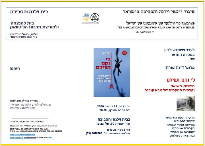 In January 2020, we convened in to listen to a lecture given by Prof. Dina Porat at the launching of her book Vengeance and Retribution are Mine, about a group of Holocaust survivors led by Abba Kovner who were seeking to avenge those who had been murdered. Dina has Lithuanian roots and the event at Beit Vilna had a family atmosphere.