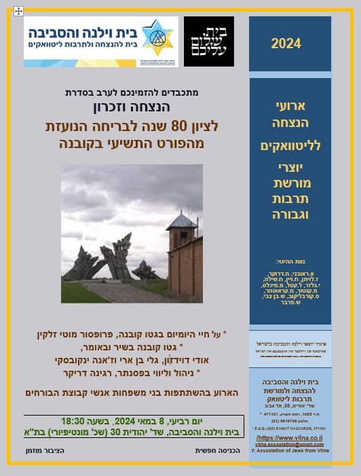 With a delay of about six months (due to the “Iron Swords” war), we gathered in May 2024 at Beit Vilna to mark the 80th anniversary of the daring escape from the Ninth Fort. Yaarit Glazer, who was born in Kovna and a member of the Association's executive board, organized the event, which was attended by families of the escapees and a large audience that filled the house.