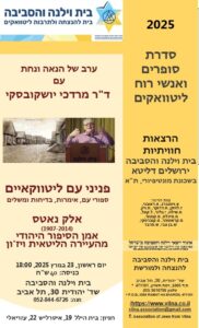 At the end of March 2025, we gathered at Beit Vilna for a lecture full of aphorisms, Jewish jokes, parables and folk tales from the towns of Lithuania presented by Dr. Mordechai Yushkovsky. Those present spent a pleasant and entertaining evening.